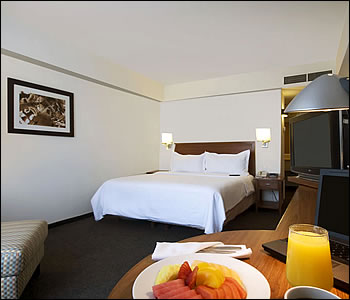 Habitación de 30 m2 con una cama King Size, 2 burós, TV de 29", sillón de lectura y escritorio con amplio espacio para trabajo, teléfono, baño equipado con tina, regadera y WC. |