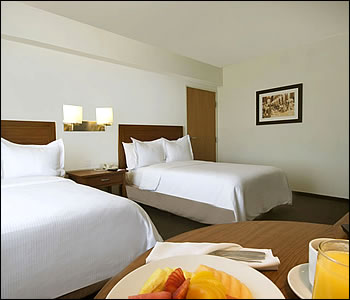 Equipada con 2 camas matrimoniales, TV de 29", escritorio con amplio espacio para trabajo, teléfono, baño equipado con tina, regadera y WC. |