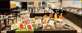 Para el desayuno puedes elegir entre una amplia variedad de platos fríos y calientes, como bollería, yogures y huevos.